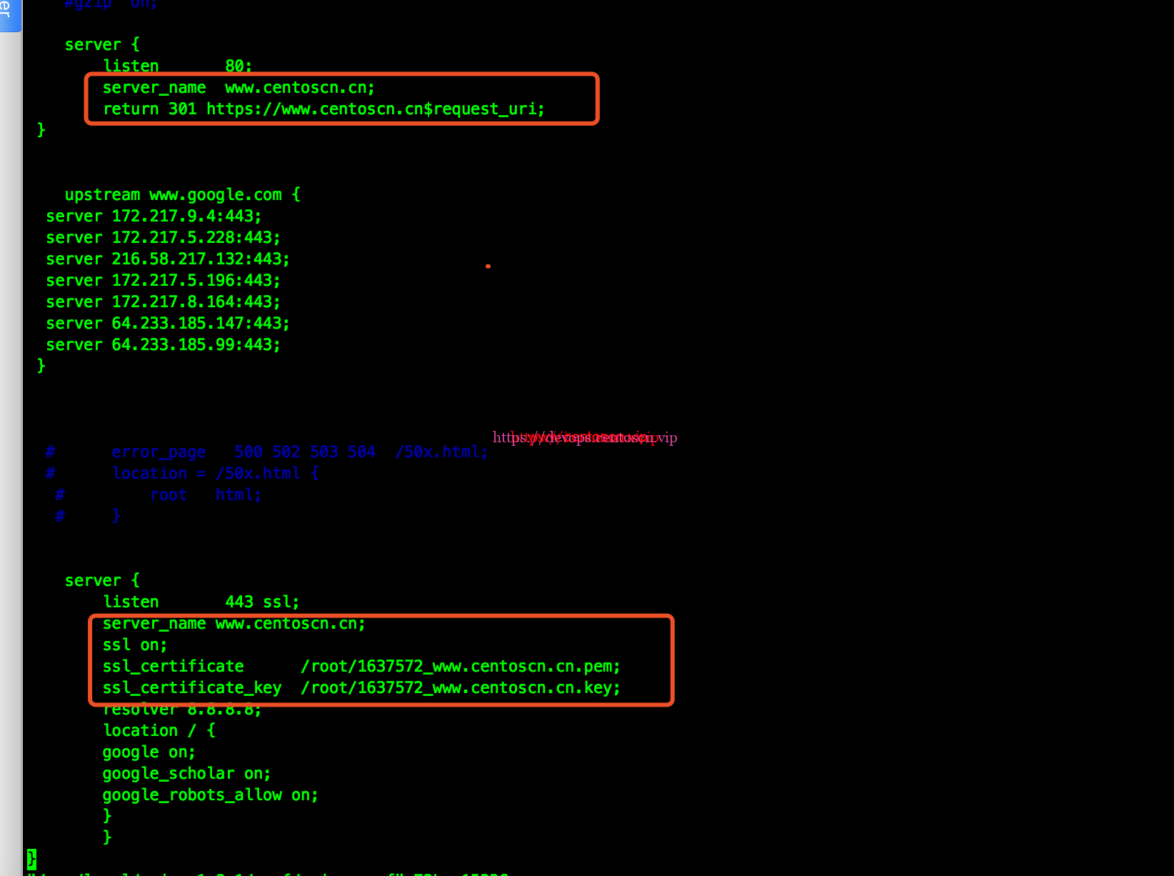 [root@e84d09fd5f12 ~]# vim /usr/local/nginx-1.8.1/conf/nginx.conf server_name www.centoscn.cn; ####修改成自己到域名 return 301 https://www.centoscn.cn$request_uri; ####修改成自己到域名 server_name www.centoscn.cn; ####修改成自己的域名 ssl on; ssl_certificate /root/1637572_www.centoscn.cn.pem; ####修改成自己的证书信息 ssl_certificate_key /root/1637572_www.centoscn.cn.key;####修改成自己的证书信息