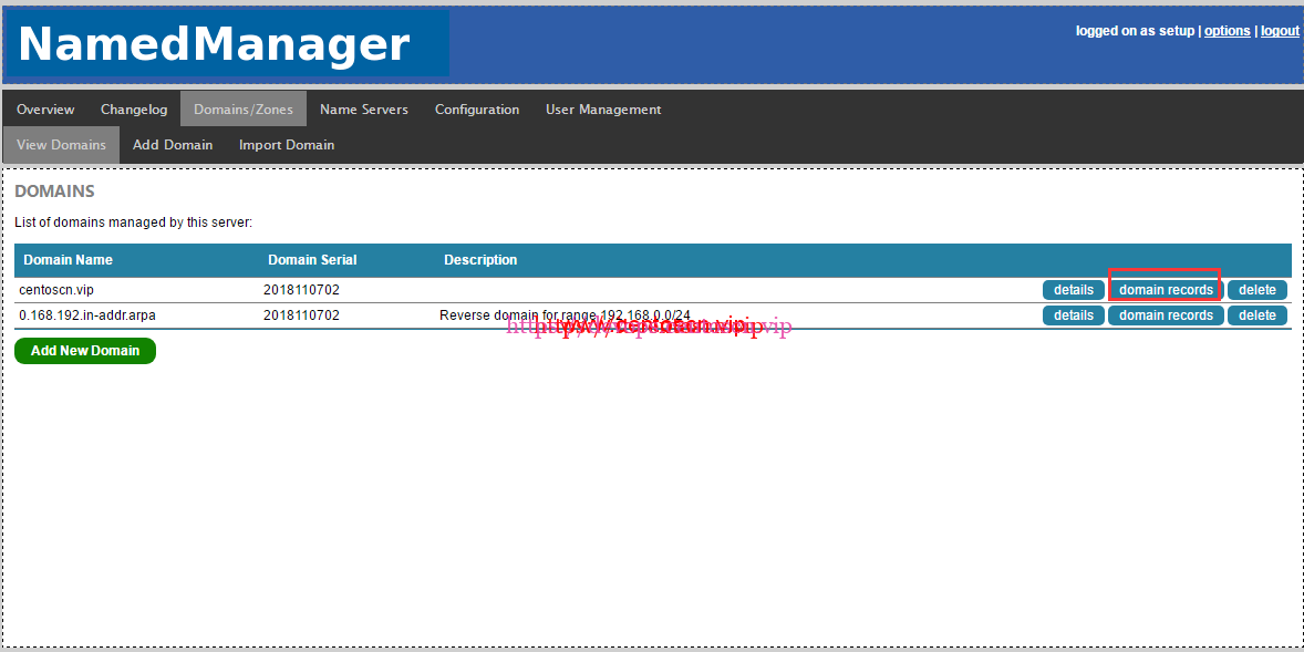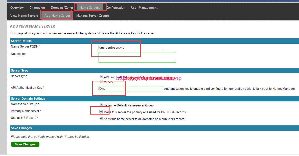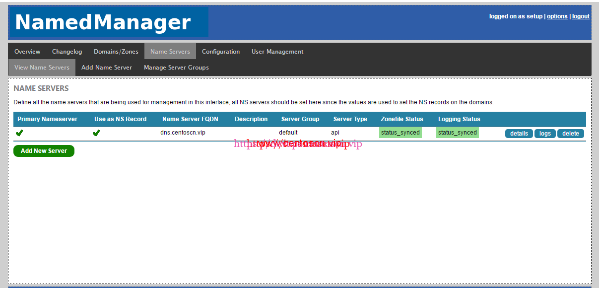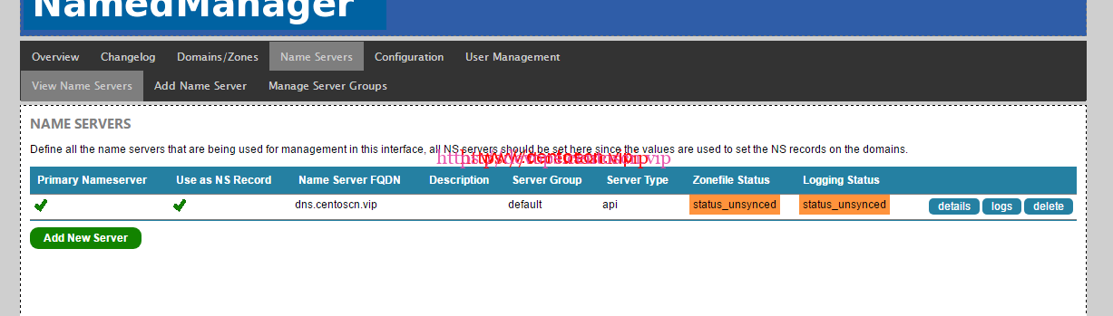 [root@instance-7tgaowaa src]# cp /etc/namedmanager/config-bind.php /etc/namedmanager/config-bind.php.bak You have new mail in /var/spool/mail/root [root@instance-7tgaowaa src]# vim /etc/namedmanager/config-bind.php $config["api_url"] = "http://192.168.0.2/namedmanager"; // Application Install Location $config["api_server_name"] = "dns.centoscn.vip"; // Name of the DNS server (important: part of the authentication process) $config["api_auth_key"] = "Dns"; // API authentication key