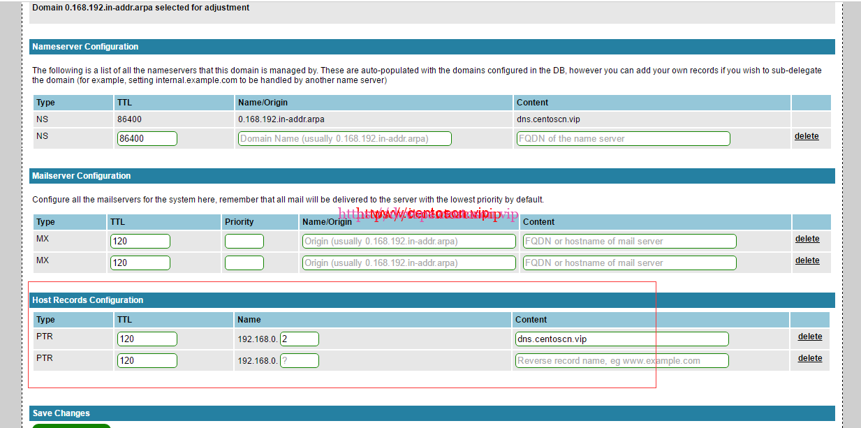 上面已经成功添加了正反向解析域名,现在尝试添加一些域名的A记录和PTR记录