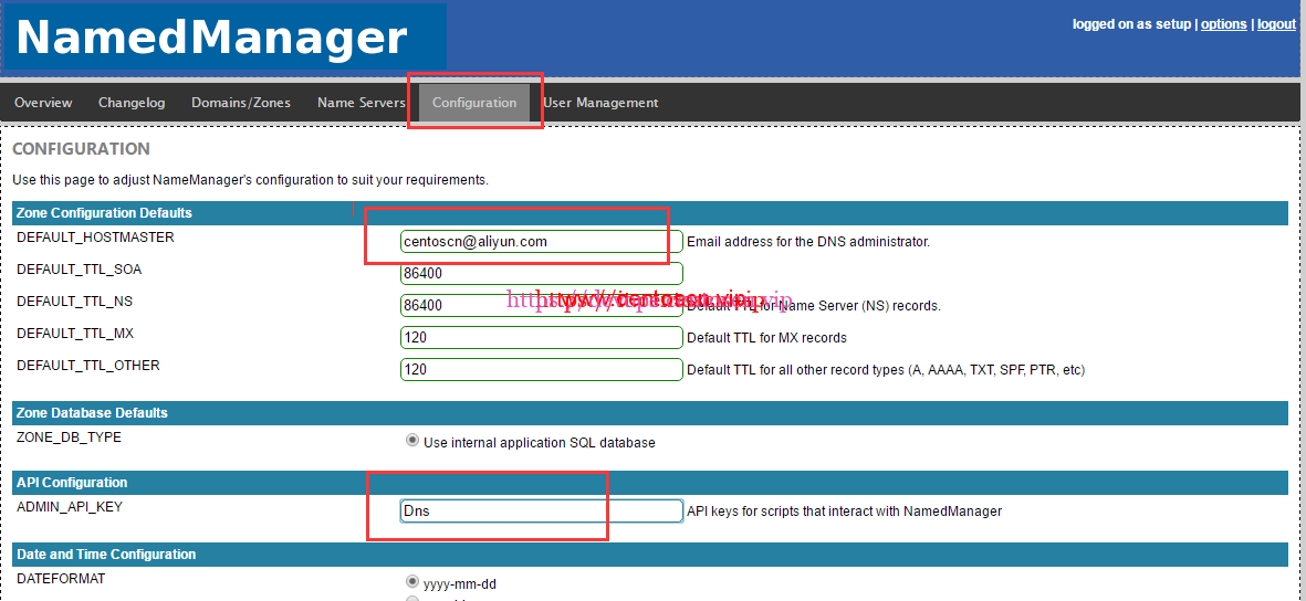 接着设置API key(如下图。设置邮箱地址和API key,这个key是在上面的/etc/namedmanager/config-bind.php文件中设置的)