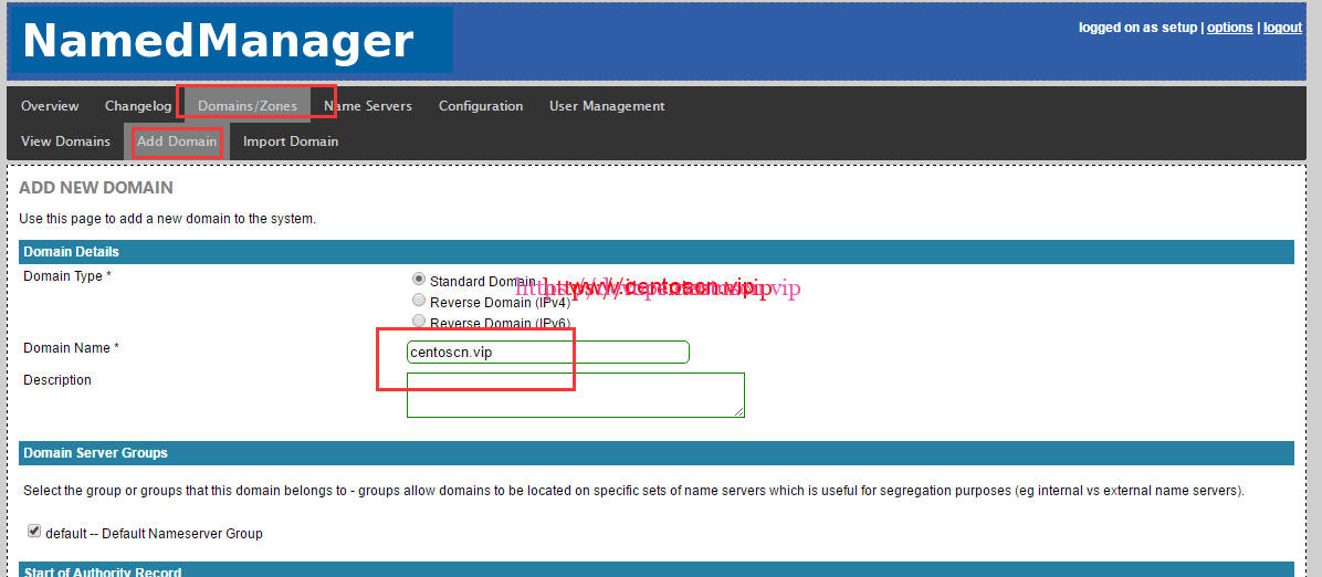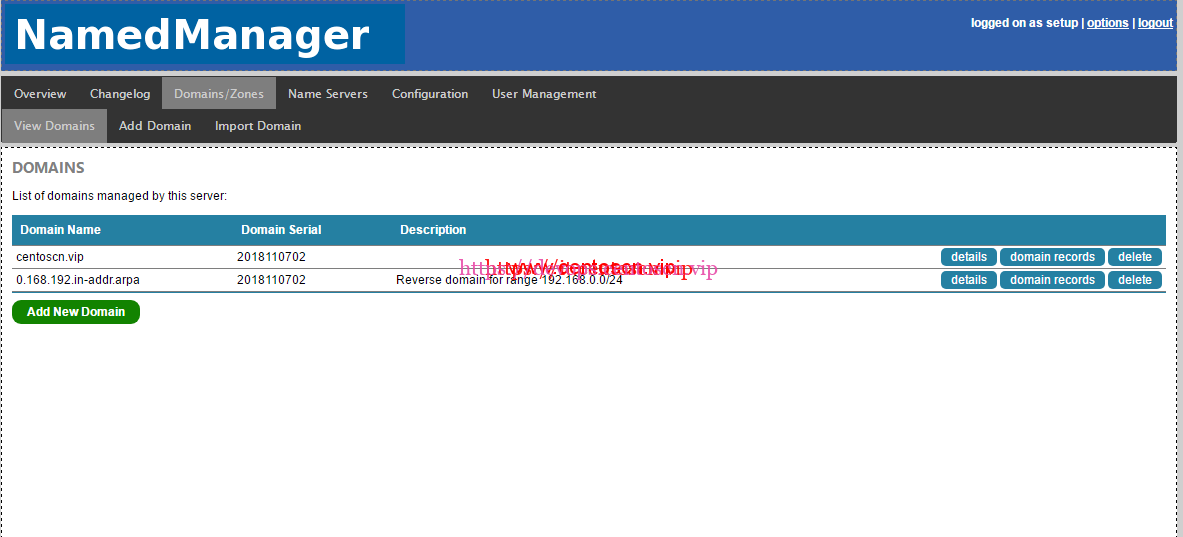 [root@instance-7tgaowaa src]# cd /usr/share/namedmanager/resources/ [root@instance-7tgaowaa resources]# ./autoinstall.pl autoinstall.pl This script setups the NamedManager database components: * NamedManager MySQL user * NamedManager database * NamedManager configuration files THIS SCRIPT ONLY NEEDS TO BE RUN FOR THE VERY FIRST INSTALL OF NAMEDMANAGER. DO NOT RUN FOR ANY OTHER REASON Please enter MySQL root password (if any): 123456 Searching ../sql/ for latest install schema... ../sql//version_20131222_install.sql is the latest file and will be used for the install. Importing file ../sql//version_20131222_install.sql Creating user... Updating configuration file... DB installation complete! You can now login with the default username/password of setup/setup123 at http://localhost/namedmanager