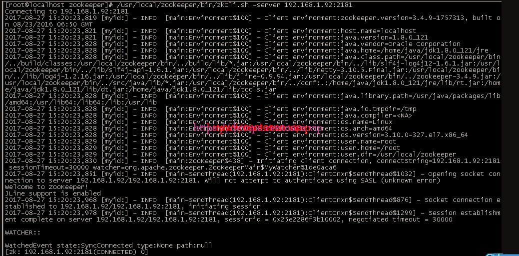 [root@localhost zookeeper]# /usr/local/zookeeper/bin/zkCli.sh -server 192.168.1.92:2181